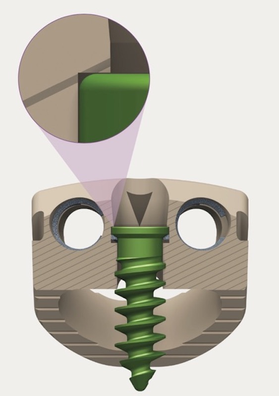 The CoRoent Small Interlock PEEK ACDF spacer is a no-profile intervertebral implant designed for reduced surgical exposure, minimal number of implants, and simplified implantation procedure. The circumferential locking ledge with visible triangle laser marks within the screw hole provide both tactile and visual confirmation of the locking mechanism.