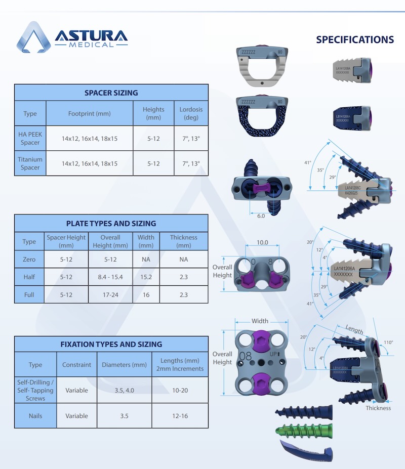 The Dolomite Stand alone ACDF cervical system by Astura Medical is a system that provides a range of fixation options for anterior plating. It features a modular system of the core (using either HA PEEK or etched titanium) along with Plating options: Zero-profile, half plate (3 hole), full pate(4 hole)