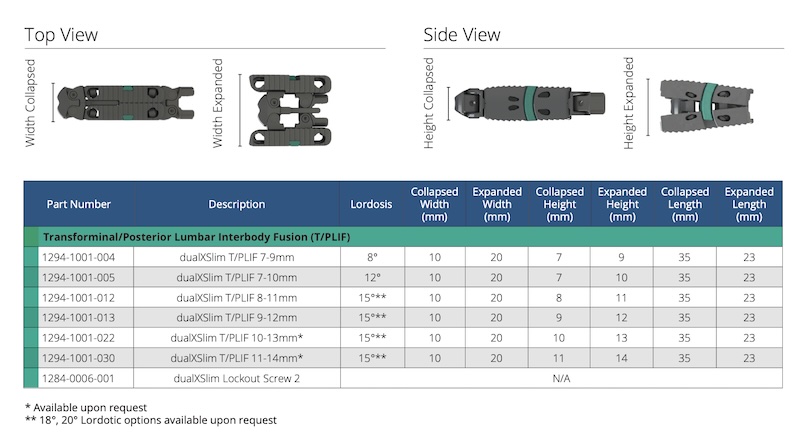 The dualX Slim is a Bi-directional expandable interbody spacer with the smallest insertional footprint. The implant is intended to be inserted via a TLIF approach and expands in both horizontal and vertically with progressive lordosis of 8, 12, 15, and 18 degree.