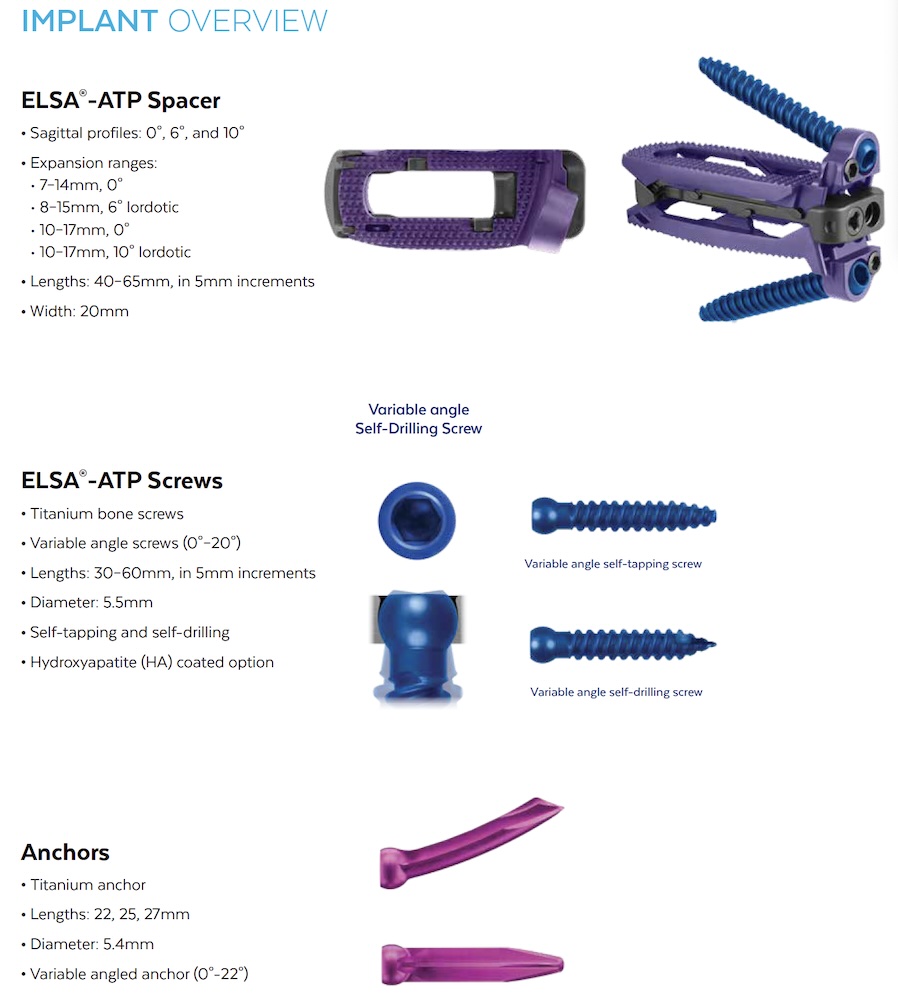 The ELSA-ATP is an integrated screw fixation expandable lateral interbody spacer for use in the Anterior-to-psoas (ATP) approach designed to help alleviate challenges associated with the iliac crest when approaching L4-5 in a lateral approach. The spacer features an angulated location of the screw fixation to accommodate the variation in approach angle.