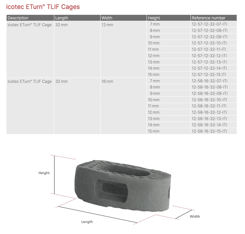 The ETurn TLIF Cage by icotec is a titanium coated carbon fiber/PEEK spacer using proprietary titanium coating Ti-iT and BlackArmor Carbon/PEEK material. The coating allows bony ingrowth and cellular adhesion while maintaing the benefits of artifact-free post operative imaging.