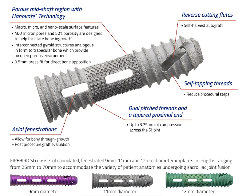 The Firebird SI is a 3D printed titanium Sacro-iliac fixation screw for use in the MIS lateral SI fusion approach. The Screw is a cannulated and fenestrated screw with cutting threads to harvest autograft with a central porous region for bony ingrowth.