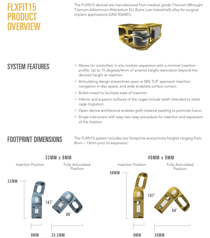 The FLXfit 15 is a novel TLIF implant composed of titanium that is inserted through a traditional TLIF approach and has an articulating footprint to allow for maximal endplate coverage. After articulation, the graft can be expanded up to 15 degrees in the center or up to 4mm in height