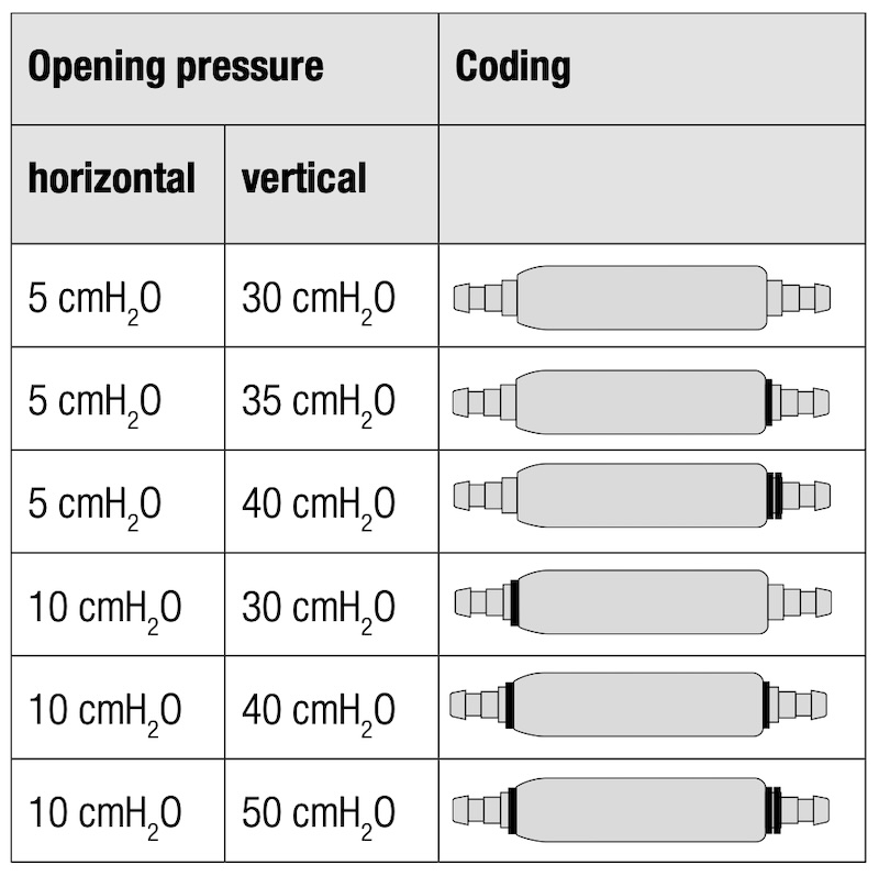 The GAV Gravity Assisted Valve by Miethke (Aesculap) is a position dependent 2-in-1 valve with a spring-loaded ball-in-cone fixed pressure differential valve combined with a gravitational unit that drains at different pressures depending on the vertical to horizontal position. The Gravitational unit is comprised of a weighted tantalum ball that presses down on a sapphire ball to increased the pressure required to open the valve. In the upright position, the closure of the gravitational valve prevents the siphoning effect.