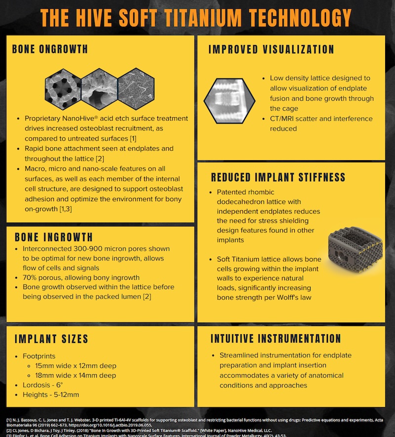 The HIVE C Cervical Interbody System by NanoHive is a unique solution for fixation in the ACDF procedure. The spacer features a unique internal architecture that allows independent endplates that reduces device stiffness and allows new bone growth to be under load. The 3D printed titanium spacer is also treated with Acid surface etching to increase surface micro-architecture for increased bony adherence.