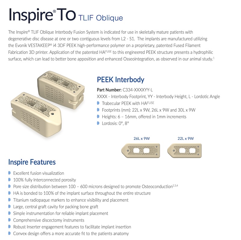 The Inspire TO TLIF Oblique Interbody System by Curiteva is a 3D printed PEEK interbody spacer that it surface treated with HAFuse, a proprietary method that bonds hydroxyapatite to 100% of the implant surface. It is intended for implant in the oblique orientation in the TLIF approach of the lumbar spine.