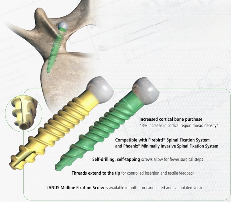 The Janus Midline Cortical Pedicle screw fixation system by SeaSpine-Orthofix is a modular head system used for fixation of the thoracolumbar spine. It features a dual pitch thread and has both cannulated, non-cannulated, and fenestrated options.