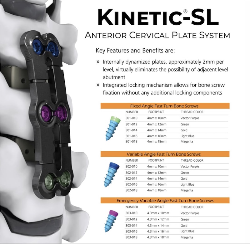 The KINETIC by Life Spine is a Dynamic Anterior cervical plate for supplemental fixation in the ACDF procedure. The plate allows for up to 2mm of dynamic movement per level. Features a rotating screw blocking mechanism to prevent screw back-out.
