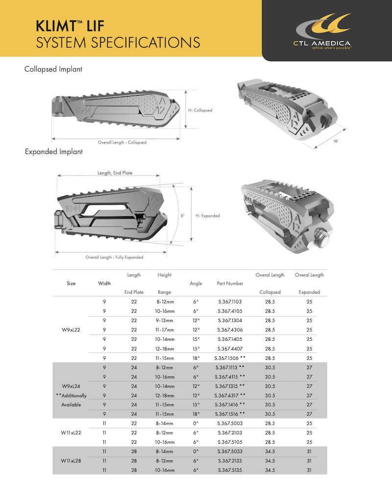 The KLIMT is an Expandable 3D printed Titanium lumbar interbody spacer by CTL Amedica. The KLIMT lumbar interbody Fusion system is intended for use in the oblique TLIF or bilateral PLIF approach. It is intended to expand parallel up to 6mm in height.