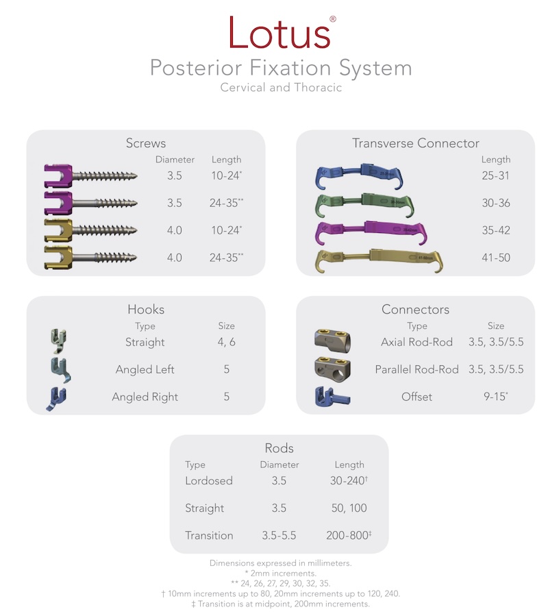 The Lotus Posterior Cervical-Thoracic Fixation system by Spinal Elements is a comprehensive posterior lateral mass and pedicle screw fixation system that features a high favored angle up to 45 degrees and 40 degree in all other angulation. Comes as a complete system with rod connectors, transition rods, offset connectors etc.