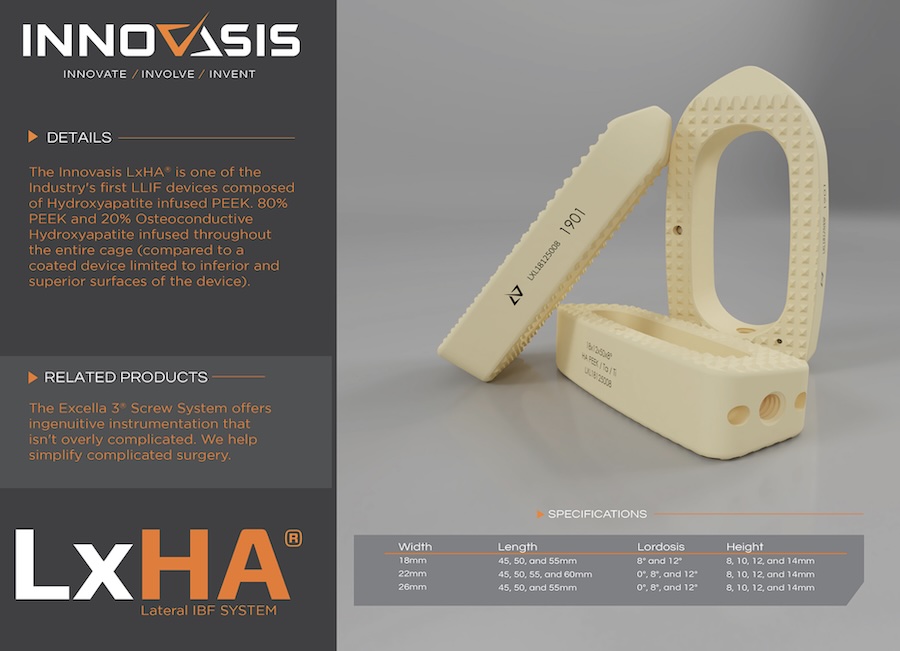 The LxHA Lateral by Innovasis is a PEEK interbody spacer integrated with 20% Hydroxyapatite crystals throughout the implant rendering it hydrophilic and increased osteoconductivity. The spacer is intended for use in the direct lateral retroperitoneal approach.