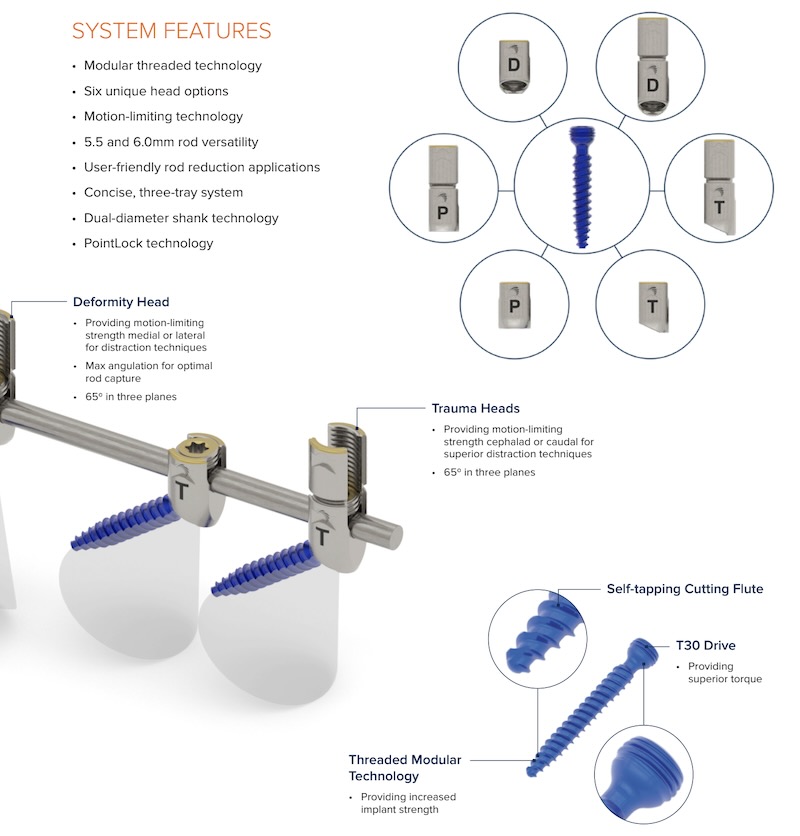 Features: Fenestrated , Detachable/ Modular Head , K-Wire Cannulated , Polyaxial Head , Favored Angle Head , Self Tapping , Percutaneous Screw , Extended Reduction Head Tabs
