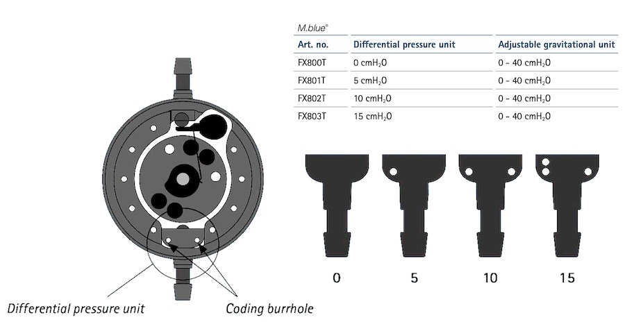 M.Blue Plus version of the valve configuration is a combination of the proGAV adjustable differential pressure valve and the M.Blue gravitational valve with a 0 cmH2O differential pressure unit.