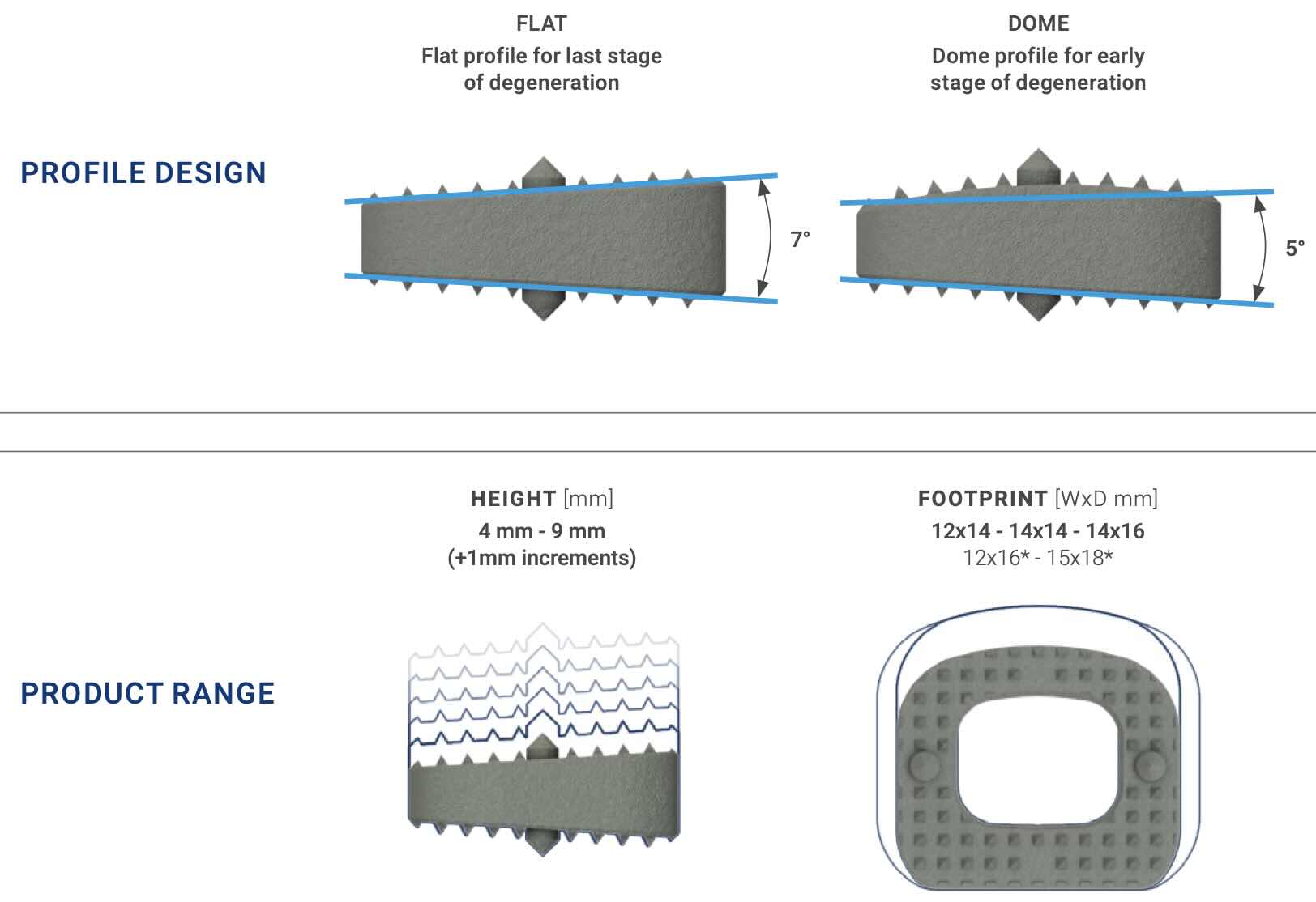 The Mecta-C All-in-One ACDF Anterior cervical discectomy and fusion system by Medacta includes PEEK and titanium coated PEEK options for spacer cages. These come in both flat and domed options with 7 and 5 degree lordosis options respectively.