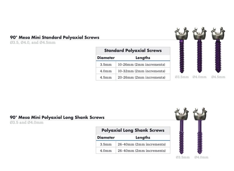 The Mesa Mini Spinal system is a cervical and thoracic stabilization system that features a low-profile top loading head with zero profile above the rod. Features a high degree of conical angulation 90 degrees.