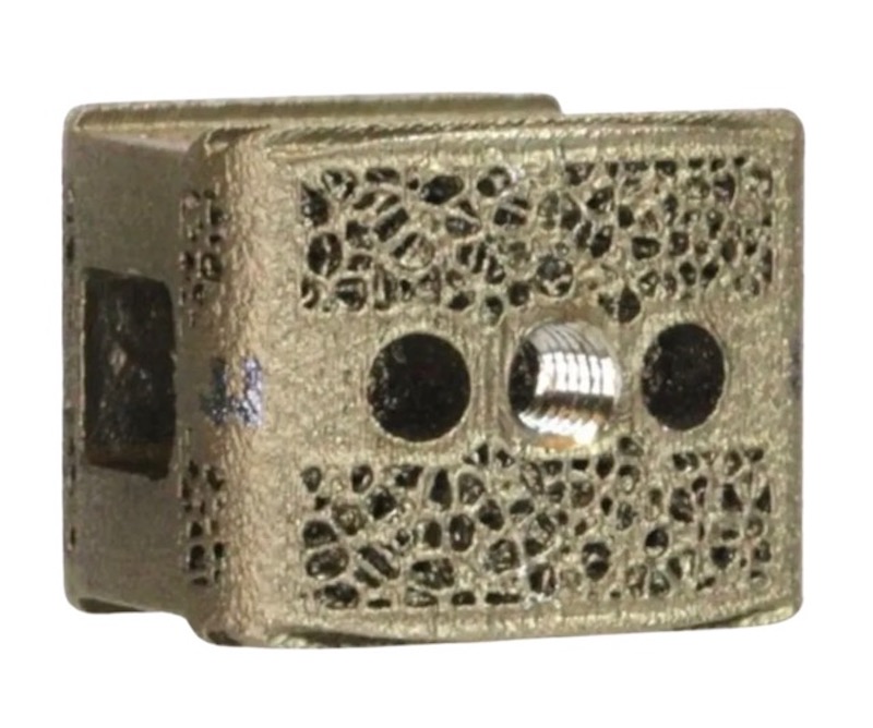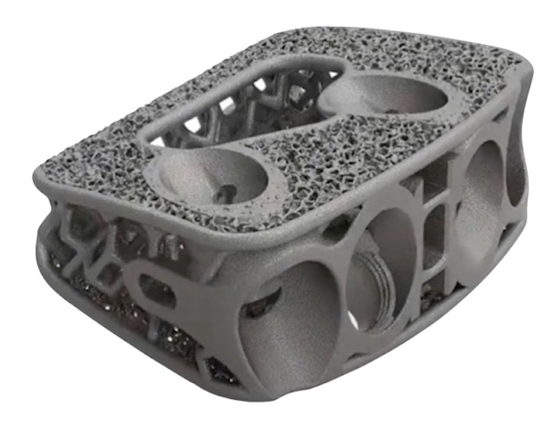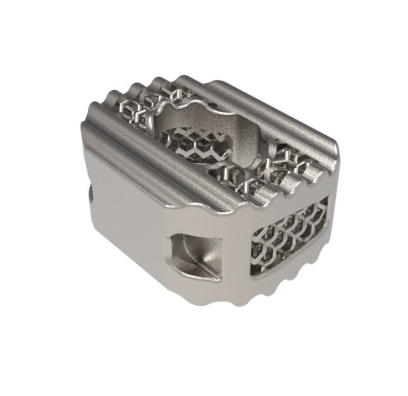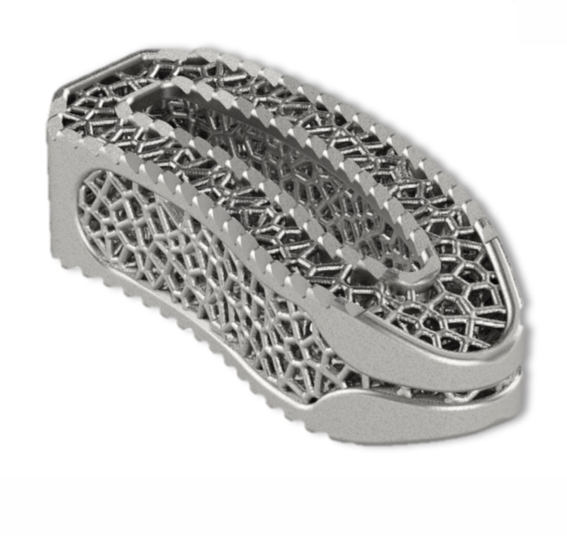 Fully porous 3D printed titanium implant designed to provide a favorable environment for bone in-growth for enhanced osseointegration, allowing for both strength and radiolucency.