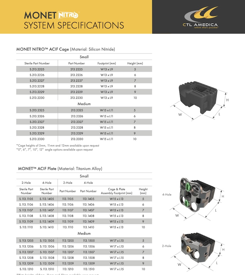 The MONET NITRO by CTL Amedica is part of the NITRO family of Silicone Nitride interbody spacers and is a modular anterior cervical spacer and plate combination for use in the ACDF procedure. The Silicone Nitride spacer assembles to multiple plate options including a zero-profile 2-hole plate and a minimal profile 4-hole plate.