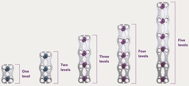 The Anterior Cervical Plate System by NuVasive comes in an array of implant options with optimized plate lengths, stiffness, and profile for every level. The plates are designed with a lordotic curve, but if necessary, the plate can be manually contoured between the screw holes and retaining mechanisms for customized lordosis.