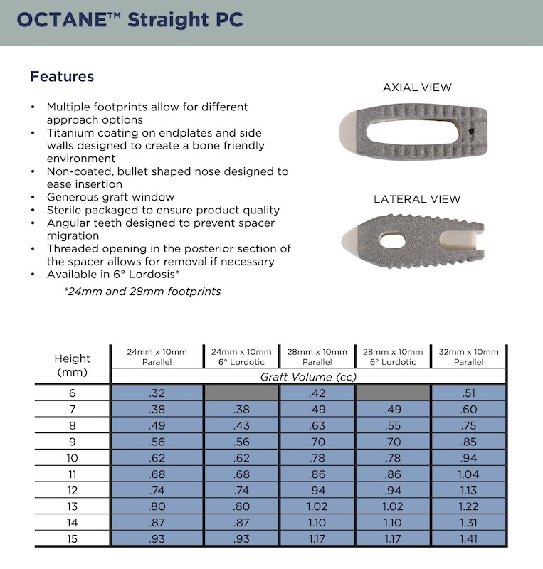 The OCTANE PEEK Straight PC by Choice Spine is a PEEK and Plasma Sprayed titanium coated PEEK straight spacer for use in the oblique TLIF approach or bilateral PLIF approach.
