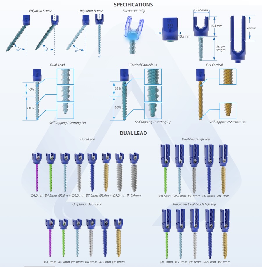 Features: K-Wire Cannulated , High-Angulation Screw , Polyaxial Head , Fixed Head , Medial Cortical Screw , Self Tapping , Extended Reduction Head Tabs