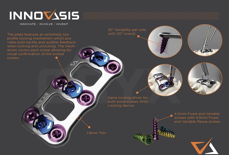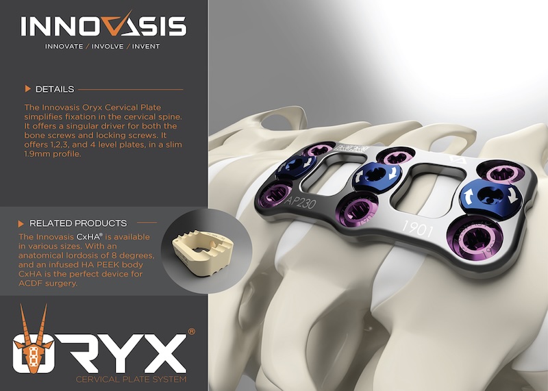 The ORYX Anterior Cervical Plating System by Innovasis is a locking ACP that utilizes the same driver for screw insertion and closing of the locking screw cam. The plate features 10 degree angulation variability for 20 degree overall angulation at the ends.