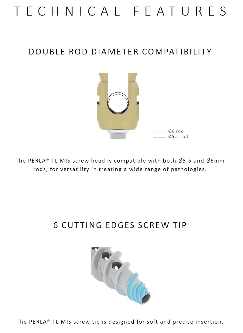 The Perla TL MIS by Spineart is a comprehensive thoracolumbar minimally invasive percutaneous pedicle screw system that features a polyaxial head with up to 60 degree conical angulation. The screws feature a dual thread cannulated and option for fenestrated holes for cement augmentation. Accepts both 5.5 and 6.0mm rod system