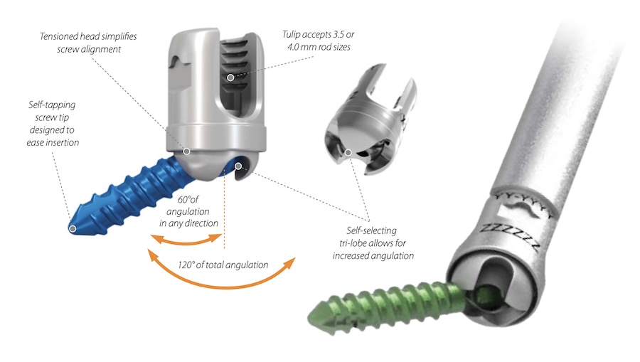 Features: High-Angulation Screw , Polyaxial Head , Self Tapping , Extended Reduction Head Tabs