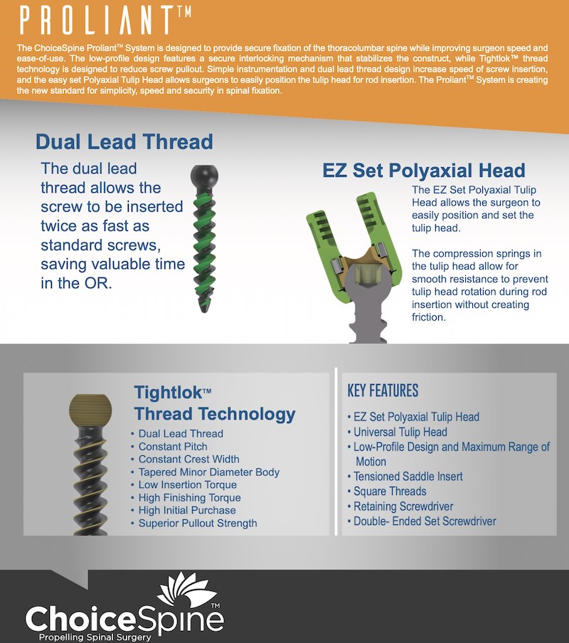 The PROLIANT thoracolumbar pedicle screw system by Choice Spine is an open system for use in the thoracic and lumbar spine and features a dual-thread screw with EZ Set Polyaxial head that allows for stable positioning of the tulip head and retains set position. Available as standard tulip and extended reduction tulip heads. Accepts 5.5mm rod system