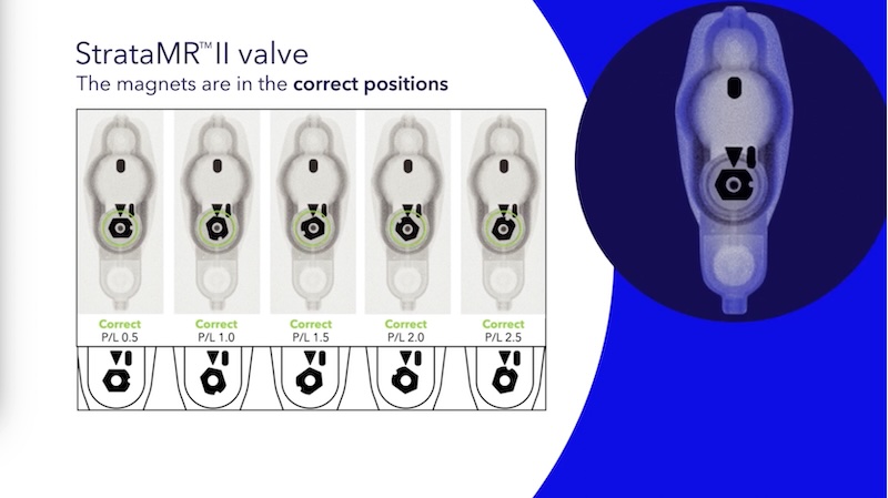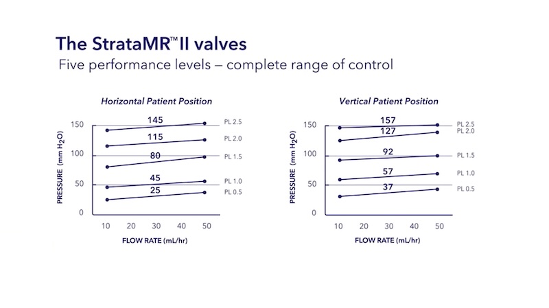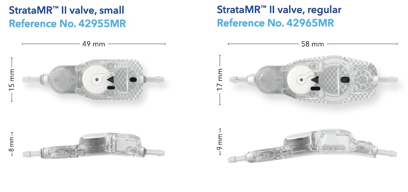 The StrataMR II valve by Medtronic PS Medical is an MRI compatible hydrocephalus shunt valve up to 3T that utilizes the same reliable adjustbale performace levels that have been used in the Strata NSC and Strata II valves. The valve utilizes a ball-in-cone that has a locking rotating adjustment key to apply pressure to the ball thereby increasing or decreasing flow resistance. It features an antisiphone Delta Chamber and comes in 2 sizes, regular and small.
