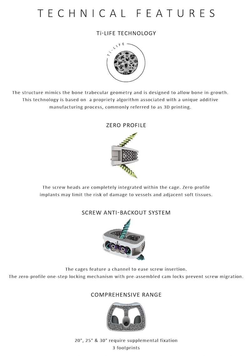 The Scarlet AL-T by Spineart is a 3D printed titanium zero-profile standalone ALIF spacer for use in the anterior lumbar interbody procedure. It features rotating locking screw cam to prevent backout and a porous internal architecture for bony ingrowth.