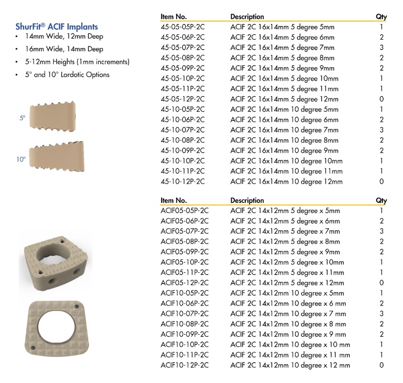 The ShurFit PEEK and ShurFit ACIF 2C by Precision Spine are PEEK interbody spacers for use in the ACDF procedure and come in standard PEEK as well as the 2C which comes with a dual layer of Plasma-sprayed Titanium coating and hydroxyapatite coating as well to improve osseointegration. This dual coating allows for increased visualization with the PEEK body and allows for increased bony integration due to the roughness of the Ti plasma spray coating.