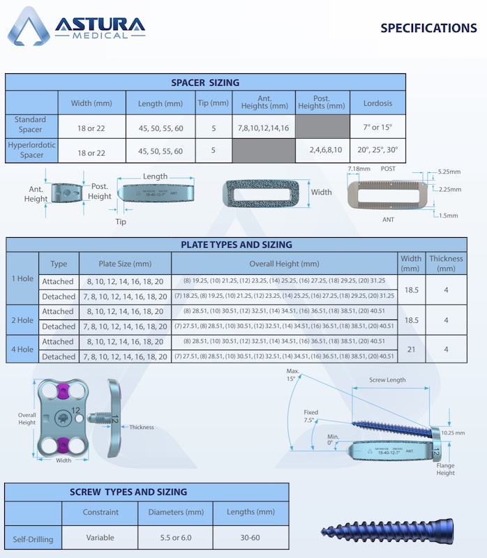 The Sirion Lateral Lumbar Interbody Fusion system by Astura Medical is a direct lateral lumbar fusion system that utilizing acid-etched titanium and HA (Hydroxyapatite) integrated PEEK. The system features plate options that mount to the cage for fixation.