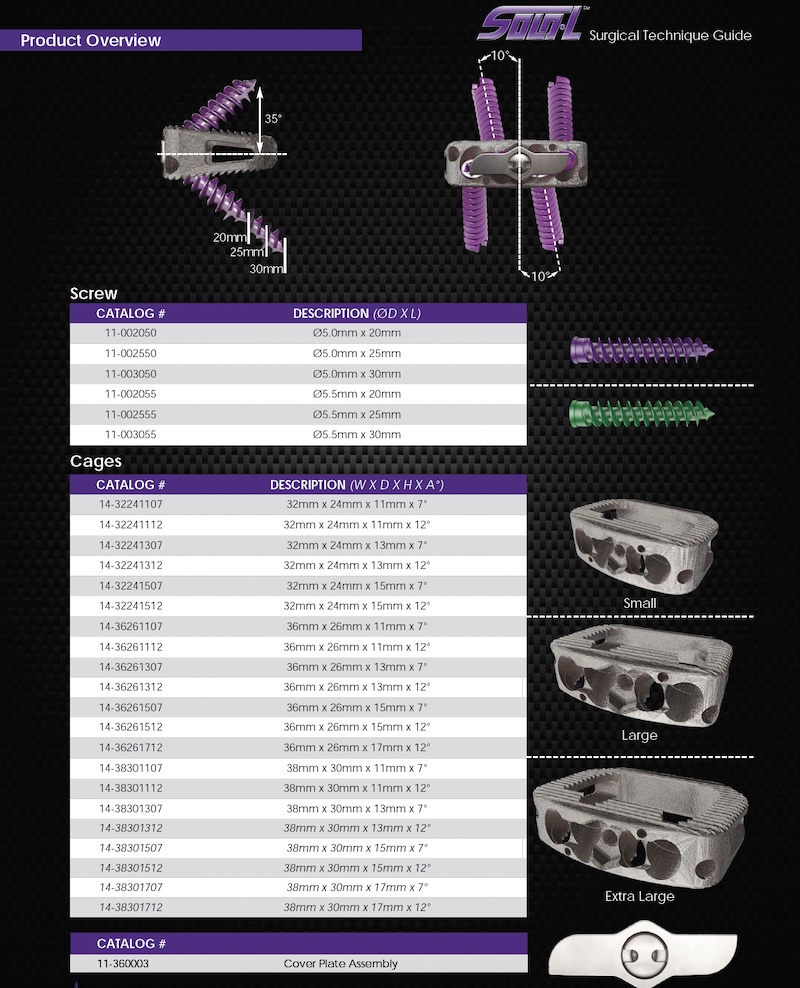 The SOLO-L Stand-Alone ALIF Cage by Aurora Spine is a 3D printed porous titanium spacer inteded for user in fixation of the anterior lumbar intterbody procedure. It features 4 integrated screw fixation with an anterior plate