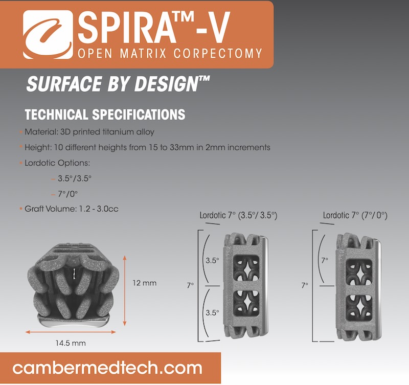 The SPIRA-V is a 3D printed titanium corpectomy spacer by Camber Spine. The cage features an open architecture spacer with large graft windows and surface texturing.