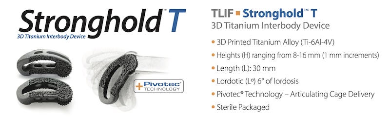 Stronghold T by Spine Wave is a 3D printed titanium transforaminal lumbar interbody device. It is made using TiCell 3D advanced surface technology which is characterized by a dual layer lattice design with optimally sized interconnected pores and surface roughness. The open architecture allows for large amounts of bone graft as well as implant visualization and fusion assessment on post-operative imaging. It also features Pivotec technology for articulating cage delivery via a small TLIF approach.