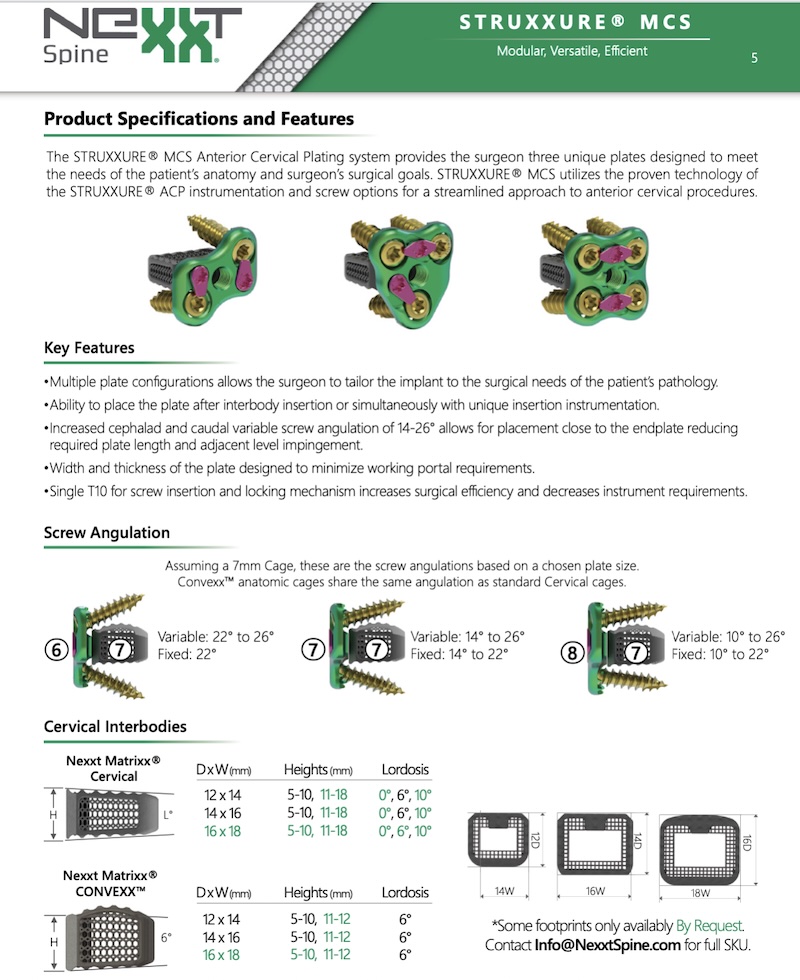 The STRUXXURE MCS (Modular Cervical System) by Nexxt Spine is a modular anterior cervical plating system that can be used alone as a low profile plate or assembled prior to implantation as a conjoined construct. STRUXXURE MCS is compatible with Nexxt MATRIXX cervical interbody or PEEK interbody.