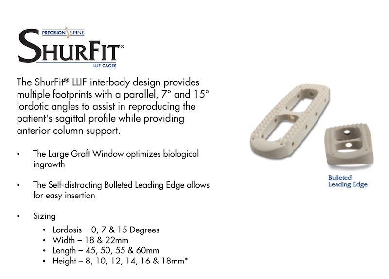 The SureFit Lateral Lumbar Interbody Spacer by Precision Spine is an all PEEK Spacer with the optional use of the lateral AccuFit plate that affixes directly to the spacer.