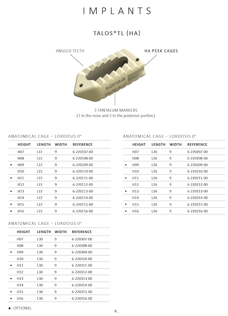 The Talos TL by Spineart is an HA (Hydroxyapatite) integrated PEEK spacer intended for use in the posterior oblique TLIF or bilateral PLIF procedure. It features a biconvex design with HA integrated into the PEEK making it hydrophilic and osteoconductive.