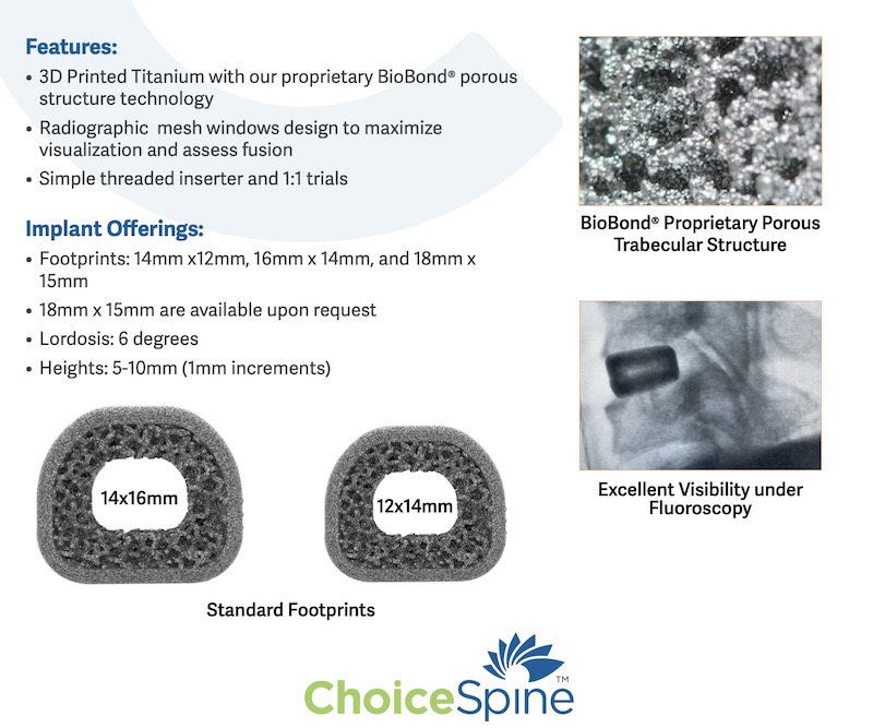 The TigerShark C by Choice Spine is a 3D printed titanium ACDF spacer utilizing Choice Spines proprietary porous trabecular metal technology. The spacer has a large central window and requires supplemental fixation with several options.