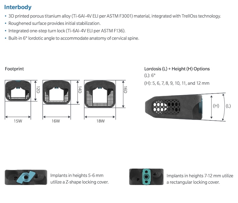 The TrellOss -C SA is a standalone ACDF spacer with integrated screw fixation originally sold by Zimmer-Biomet now owned by Highridge Medical. It features a 3D printed open architecture with 70% porosity and a large graft window. Locking screw mechanism with a twist lock to prevent screw migration.