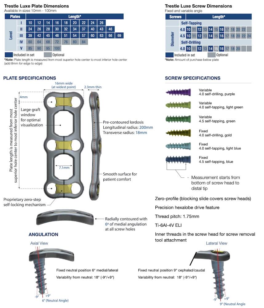 The Trestle Luxe plate is an anterior cervical plate system that is intended for use in the ACDF procedure and available size options for 1-3 levels with 4 and 5 level options available on demand. Differences between this and the Luxe II plate is that Luxe II has a temporary pin site above and below for easier placement of screws. The Trestle Luxe has less cranial/caudal screw angulation at 9 degrees where Luxe II has 28 degrees.