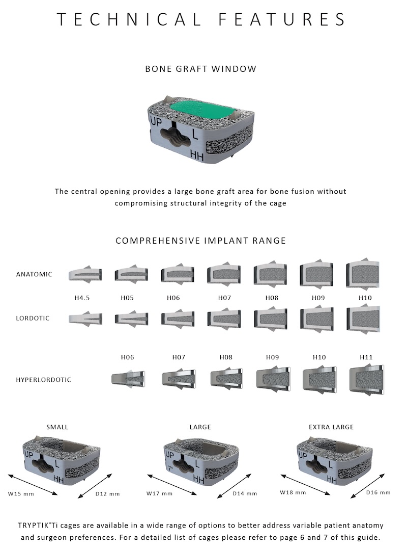 The Tryptik Ti by Spineart is a 3D printed titanium spacer intended for use in the ACDF procedure. It features the proprietary TiLIFE 3D porous titanium architecture and is available in lordotic or anatomical contour. It comes as a spacer alone and requires supplemental fixation.