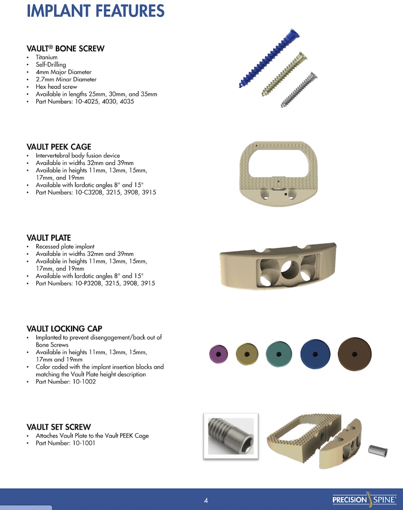 The VAULT Zero-profile PEEK ALIF Spacer by Precision Spine is a modular PEEK spacer and PEEK anterior plate construct that offers true stand alone fixation with integrated screws. The modular nature of the spacer allows attachment of the plate to the spacer and a locking screw cap to prevent backout.