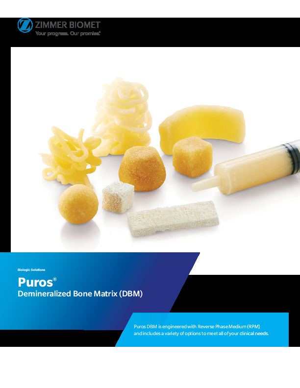 Puros DBM Demineralized Bone Matrix by Highridge Medical (Previously Zimmer-Biomet which was spun off as ZimVie in 2024 and now sold under Highridge Medical) is a group of DBM products with reverse phase medium. The reverse phase medium is a compound which makes the putty more pliable at lower temperatures and become more viscous and less pliable at body temperature. Available as putty and putty with chips which includes cancellous chips in the putty.