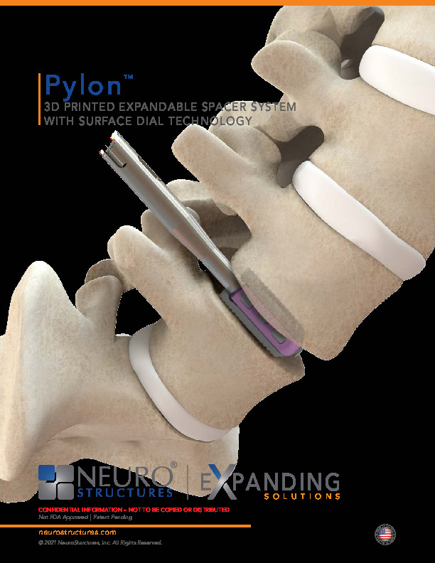 The Pylon expandable cage by NeuroStructures/NuGen was created to provide anterior, parallel, and posterior expansion of the upper and lower plates, that can address even the most difficult pathologies in PLIF and TLIF procedures. The spacer is made of titanium alloy with 3D printed textured titanium endplates, to promote immediate mechanical fixation and progressive bony ingrowth. The low profile bulleted design minimizes neural retraction and force of impaction, and preserves endplate integrity.