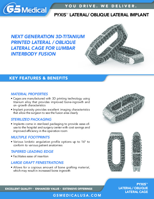 The Pyxis Lateral/Oblique Implant by GS Medical is a 3D printed porous titanium Spacer for use in the direct lateral or oblique retroperitoneal approach to the lumbar spine.