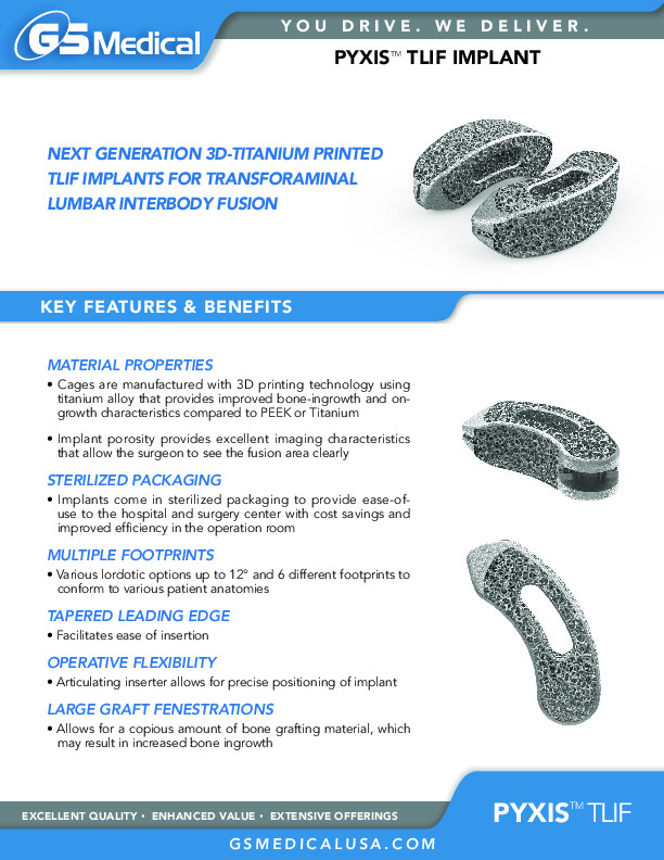 The Pyxis TLIF Interbody System by GS Medical is a 3D printed porous titanium curved TLIF spacer. It features a bulleted nose for easy insertion and a highly porous interior of improved bony ingrowth. The articulating inserter allows for easy placement in the anterior disc place.