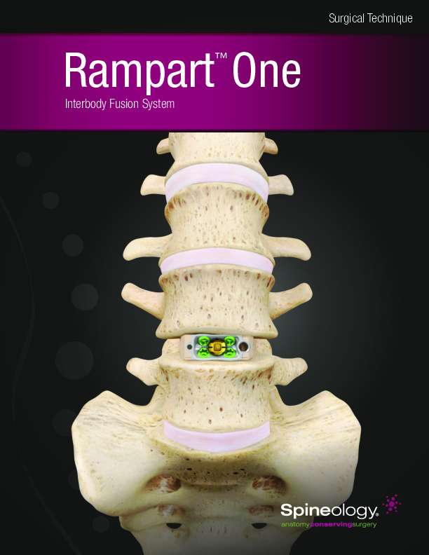 Rampart One by Spineology is an HA infused PEEK lumbar interbody fusion device, designed for anterior and oblique approach. The instrumentation and design of the system minimizes exposure and retraction with multiple implant insertion angles to reduce the risk of vessel injury. The standard anterior device accommodates four screws and the oblique device accommodates two screws. The implants are made of Hydroxyapatite (HA) that is integrated throughout the PEEK material improving durability, and making the HA available to the body on all surfaces of the implant to support bone growth.