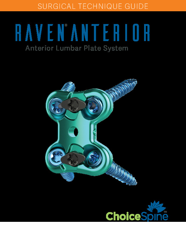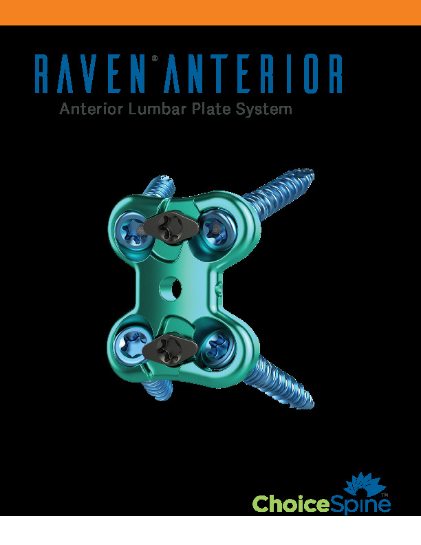 The Raven Anterior Lumbar Plating System by Choice Spine is a 4 hole Anterior place for use in the lumbar spine in the anterior approach. IT features divergent screws with a rotating locking cam for screw retention