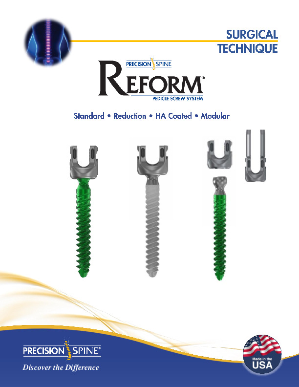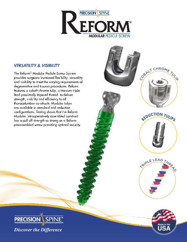 The Reform Thoracolumbar Pedicle Screw System by Precision Spine is a comprehensive system that featrues: Cobalt Chrome CoCr heads, a T20 hexalope screw post drive and comes in multiple screw options including modular head, HA coated screws, reduction heads, fixed heads